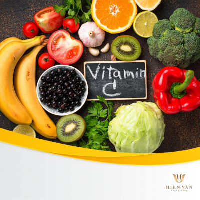 Vitamin C: Vitamin C là chất chống oxy hóa đặc biệt giúp duy trì và gia tăng tuần hoàn máu, lấy đi oxygen hoạt hóa, ngăn chặn lão hóa da. Vitamin C cũng làm mờ vết sạm da, làm mờ đốm nâu và vết nám do vitamin C có tác dụng ngăn chặn sự hình thành và làm mờ sắc tố melanin. trong chống lại sự hình thành gốc tự do tạo nên do sự ô nhiễm môi trường và khói thuốc lá. Nó cũng giúp tái tạo vitamin E sau khi vitamin E bắt giữ chất oxy hóa. Vitamin C có nhiều trong rau quả tươi, đặc biệt là bưởi, cam, táo, ổi, sơ ri, cóc chín, đu đủ chín…