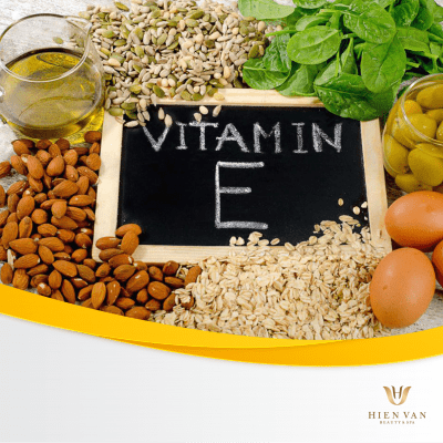 Vitamin E: Vitamin E là chất chống oxy hóa rất hiệu quả, giúp loại bỏ được sự hình thành các “gốc tự do”, giúp da khỏe mạnh, trẻ trung và săn chắc hơn. Vitamin E còn được chứng minh có hiệu quả trong việc làm giảm nếp nhăn trên da do mặt trời gây ra, và có khả năng giữ ẩm trên da tuyệt vời, giúp ngăn ngừa sự mất nước, làm tăng độ ẩm tự nhiên của da. Vitamin E có nhiều trong dầu thực vật và các loại hạt nhiều dầu, giá, đậu xanh…