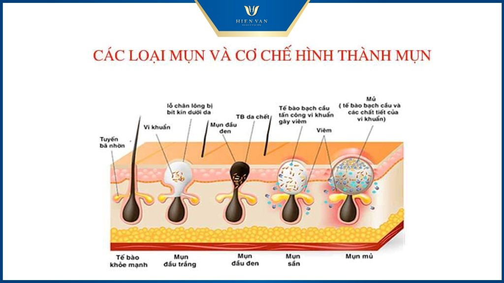 Mụn đầu đen: Mụn đầu đen hình thành do lỗ chân lông bị tắc bởi bã nhờn và tế bào da chết.